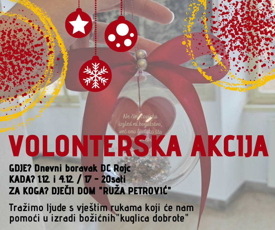 Ako si kreativac koji želi doprinijeti volonterskoj akciji "Kuglice dobrote" pozivamo te na druženje u Dnevnom boravku DC Rojc, tražimo vješte ruke za izradu božićnih kuglica dobrote: