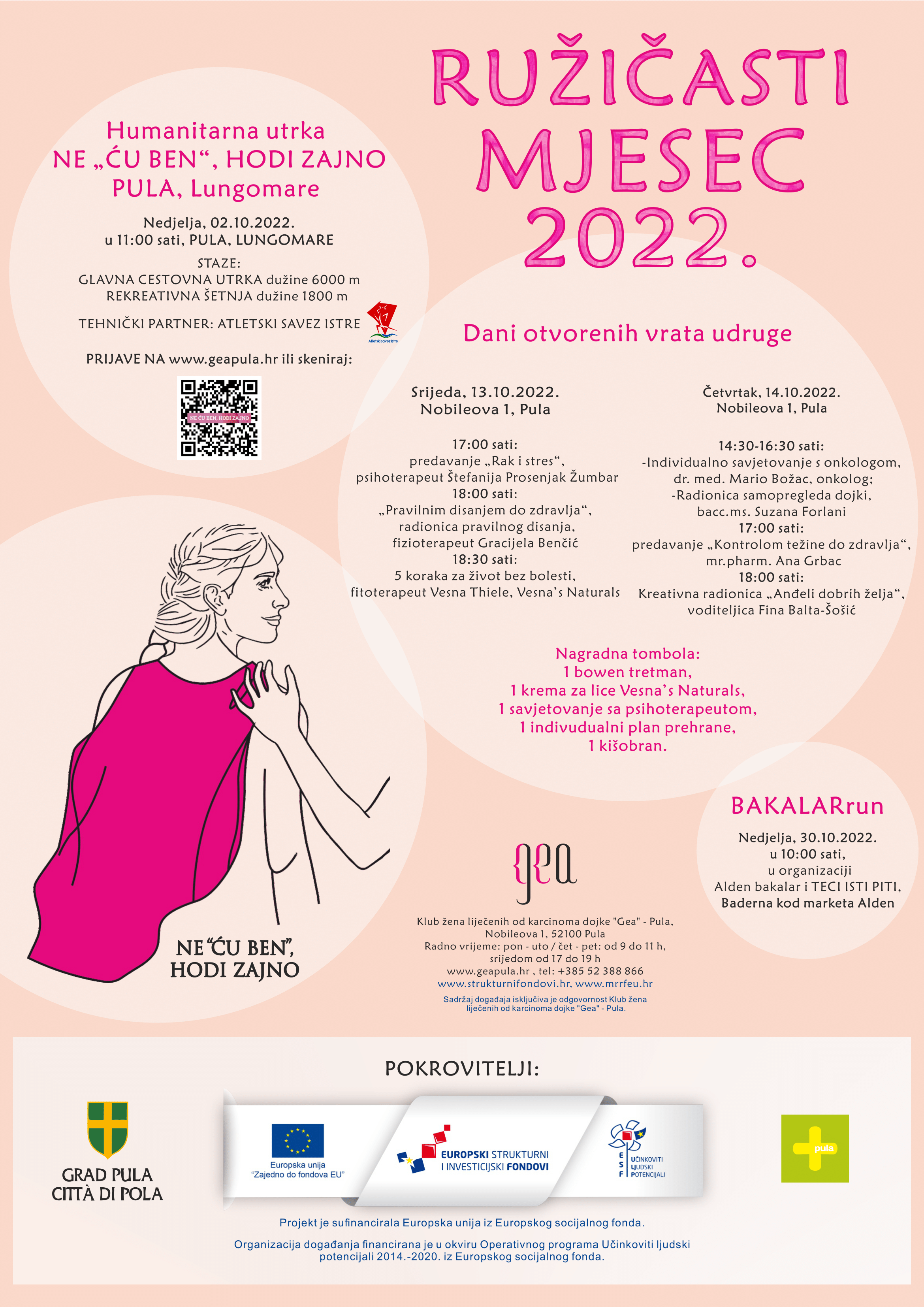 Klub žena "Gea" - Pula najavljuje obilježavanje Ružičastog mjeseca 2022. tijekom kojeg će održati niz manifestacija s ciljem podizanja svijesti o važnosti preventivnih pregleda i samopregleda dojke kako bi se rak otkrio u ranoj fazi kada je izlječiv. Naime, mjesec listopad obilježava se već tradicionalno kao mjesec borbe protiv raka dojke te udruga Gea Pula ovim putem poziva sve građane/ke da im se pridruže i podrže ih.